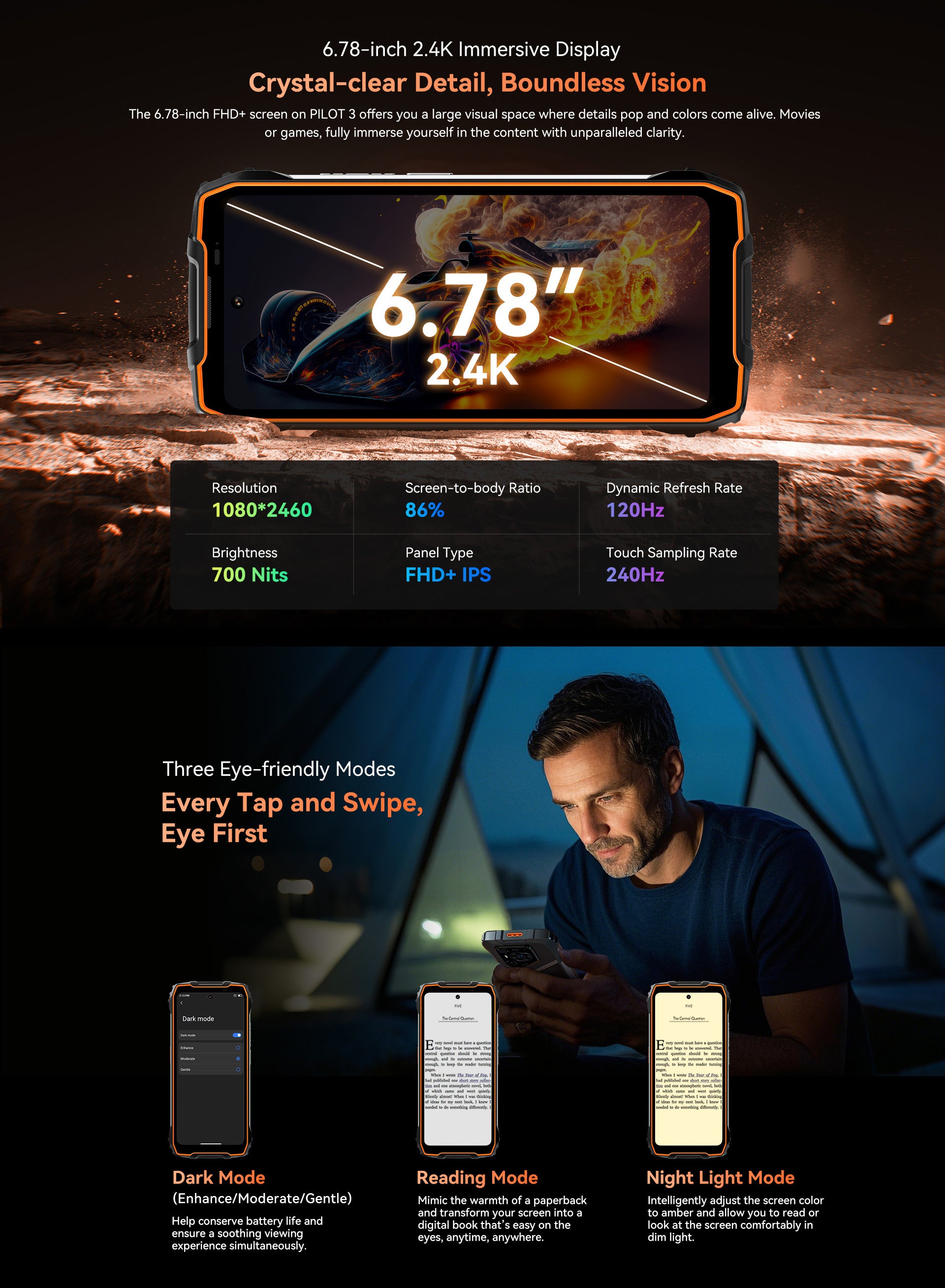 It has a durable build rated for IP68 and IP69K water and dust resistance, and meets MIL‑STD‑810H for drop protection. The 6.78-inch IPS screen delivers a 2.4K resolution (1080 × 2460) with a 120 Hz refresh rate and is protected by Corning Gorilla Glass 5.